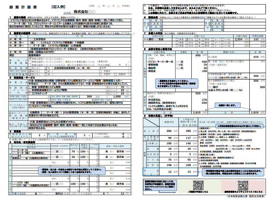 - 日本政策金融公庫の国民生活事業へ相談へ行くこととなりますが、創業計画書の記載例が公庫のHPに掲載されていますので参考にしましょう。